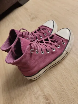 Zapatillas Converse plataforma altas de color rosa. Ideales para darle un toque moderno a tu estilo. - Son de lona. - Tienen una plataforma gruesa. - Se encuentran en buen estado, aunque presentan un ligero desgaste en algunas zonas.