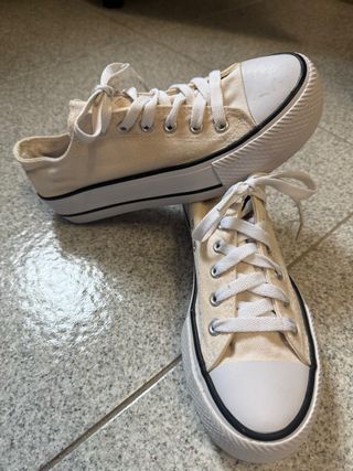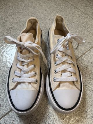 Zapatillas de lona estilo Converse en color beige y blanco. Perfectas para el día a día. Están nuevas, nunca se han usado. Sin marca. No llevan caja. - Cierre con cordones blancos. - Suela de goma. - Diseño clásico. Más cosas en mi perfil, hago envíos.