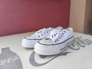 Zapatillas de estilo Converse con plataforma sin estrenar. - Diseño clásico en color blanco. - Plataforma gruesa con detalles en negro. - Cordones blancos. - Ojales metálicos.