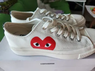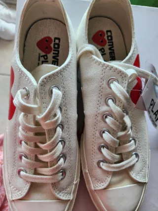 Zapatillas Converse x Comme des Garçons Play con el icónico diseño del corazón. - Color blanco con detalle de corazón rojo. - Cordones blancos. - Suela de goma. Sin estrenar. Precio negociable