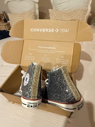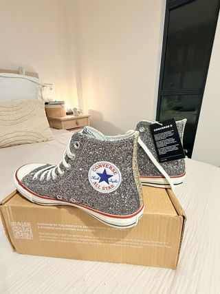 Zapatillas altas de Converse exclusivas (edición limitada), con un llamativo acabado de purpurina. Talla 40 (talla grande). Sin estrenar. - Diseño con detalles en dorado y plateado. - Cordones blancos. - Suela de goma blanca con detalles rojos. - Plantillas extra confortable de converse.