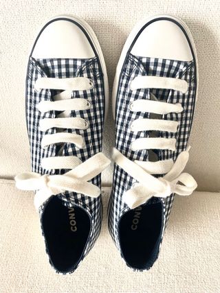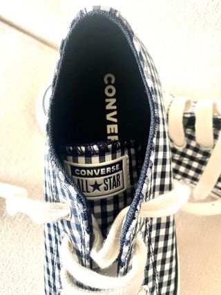 Zapatillas Converse All Star con estampado de cuadros vichy en azul marino y blanco. Nunca usadas. Llevan dos tipos de cordones, el clásico blanco y otro de encaje también blanco, como se ve en las fotos. son divinas y muy exclusivas. Perfectas para regalar o regalártelas. - Modelo bajo. - Dos tipos de cordones blancos - Sin estrenar