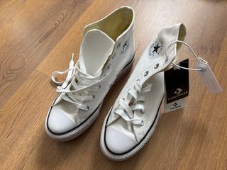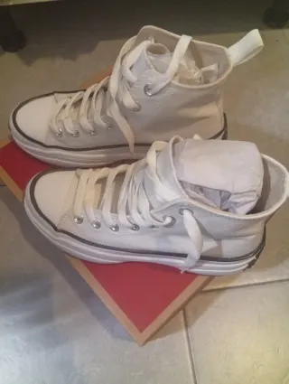 Zapatillas Converse de cuero en color blanco. - Modelo de caña alta. - Cierre con cordones. - Detalle de logo circular en el lateral. - Nuevas sin estrenar. - Se entrega con su caja original. - Son originales, se devuelven porque ha pasado el plazo de devolución.