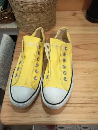 Zapatillas Converse de lona en color amarillo, sin caña y con suela imitando esparto. Muy bonitas y muy poco corrientes. - Cierre con cordones blancos. - Detalle de costuras en la puntera. - Plataforma de esparto. Están nuevas y con su caja original. Entrega en Madrid, zonas Ópera, Sol, Plaza de España o Príncipe Pío. También envío.
