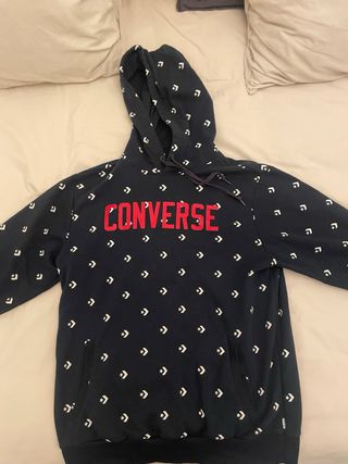 Sudadera con capucha de la marca Converse. Presenta un diseño llamativo con un estampado repetido de pequeños logos. - Estampado integral de logos. - Capucha con cordones. - Bolsillo frontal tipo canguro. R entrega cerca de Prosperidad, Avenida América o Plaza Castilla (a convenir) metros 4,7,6,9,10 Revisar el detalle que tiene abajo, no tiene más de un cm