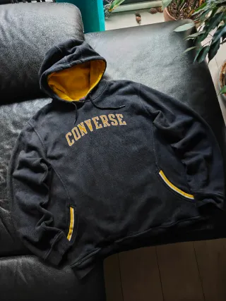 Sudadera con capucha estilo Y2K, perfecta para un look skater. - Diseño con capucha y cordones. - Logo CONVERSE en la parte delantera. - Bolsillos laterales con detalle de ribete amarillo y blanco. - Interior de la capucha en color amarillo.