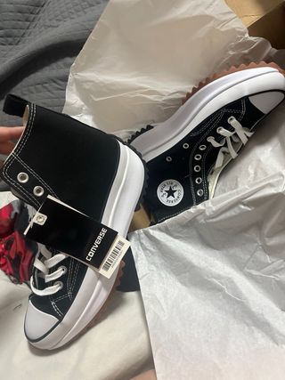 Converse Run Star Hike altas de lona, se han despintado un poco tras los lavados y no son puramente negras. Son usadas y muestran señales de desgaste. - Lona en buen estado - sin cordones en el zapato derecho