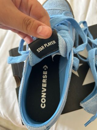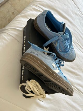 Zapatillas Converse Star Player en tonos azul y beige. Incluyen cordones adicionales. - Material exterior de ante. - Detalle de estrella lateral. - Etiqueta STAR PLAYER en el talón. Totalmente nuevas, puestas una vez para probarlas pero a mi madre le están grandes y no tengo el ticket Costaron 85€ en rebajas