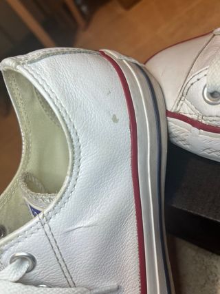 Zapatillas Converse de caña baja en color blanco. - Cierre con cordones. - Detalle de banda roja en la suela. - Logo de Converse All Star en la lengüeta. -Son originales. -Completamente nuevas. -Tienen una pequeña mancha amarillenta en una puntera.