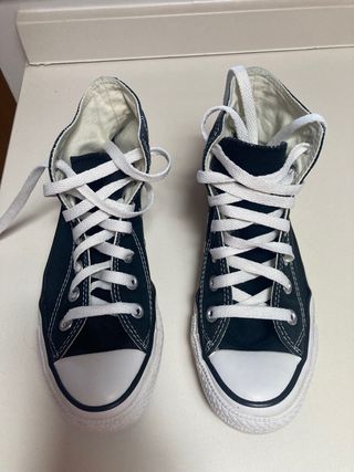 Zapatillas Converse altas de color azul, talla 37. Están en buen estado, aunque muestran señales normales de uso. - Modelo clásico Chuck Taylor All Star. - Ideales para el día a día.