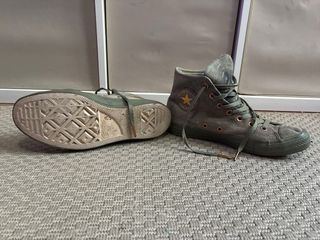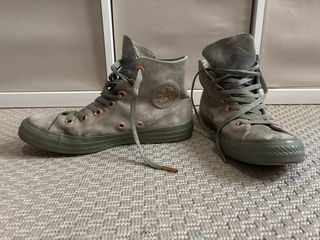 Converse Chuck Taylor altas en color verde oliva, talla 39. Son de ante y tienen un aspecto desgastado que les da un toque vintage. - Cordones color bronce. - Suela de goma.