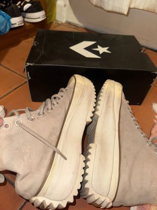 Zapatillas altas Converse en color beige con plataforma. Las vendo porque mido 1,75 y me hacen muy alta, están prácticamente nuevas, tienen marca de uso por dentro en la zona del talón. - Diseño de caña alta. - Suela gruesa con detalles. - Cordones a tono.
