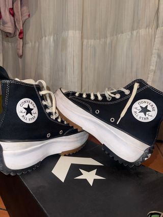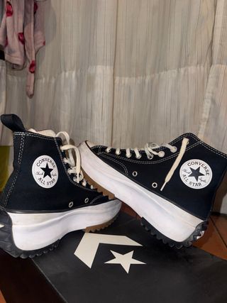 Zapatillas Converse Run Star Hike de caña alta en color negro y suela blanca. Son nuevas, me costaron 130€ en parquesur, las vendo porque tengo más y porque mido 1'75 y me hacen parecer muy alta. - Diseño con plataforma. - Cordones blancos.