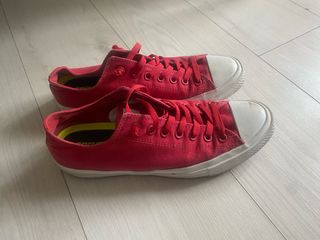 Zapatillas Converse All Star Chuck Taylor en color rojo y blanco. - Modelo clásico de caña baja. - Cierre de cordones. - Suela de goma blanca con detalles negros. - Entrego con sus cordones por supuesto pero no tenía ganas de ponérselos.