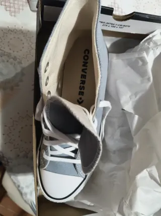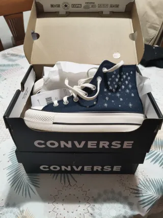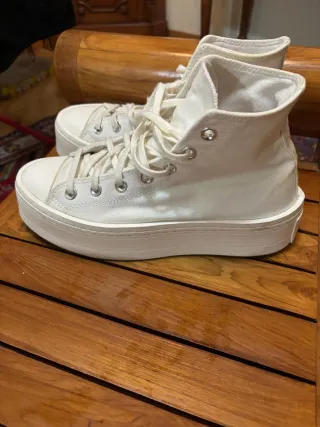Zapatillas altas Converse en color beige. Nuevas a estrenar, con un diseño clásico de caña alta, estas zapatillas combinan estilo y comodidad. Cuentan con cordones que permiten un ajuste seguro, suela de goma resistente y un elegante detalle de estrella en el lateral que les da un toque distintivo. Fueron un regalo, y además ya tengo otras parecidas.