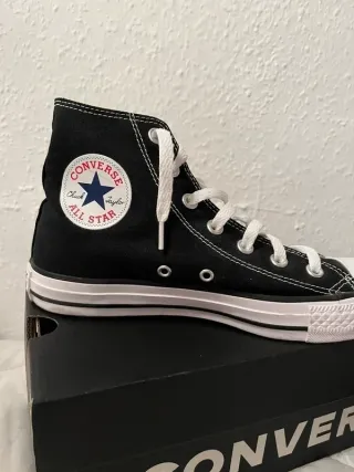 Zapatillas Converse All Star originales en color negro y blanco. Un clásico para tu día a día. - Modelo de caña alta. - Cierre con cordones blancos. - Suela de goma blanca.