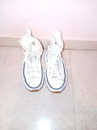 Zapatillas Converse de caña alta y baja, talla 38. Presentan un diseño único con estampado. Se ve genial, con altura de suela ajustable, solo está un poco desgastado. O sea, usado. El material es bueno, no es el típico de Converse sino un modelo exclusivo. Por desgracia, está agrietado justo en el sitio donde siempre se doblan primero los Converse. Se ve en la foto. Para quien no sea muy tiquismiquis, está perfectamente bien.
