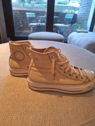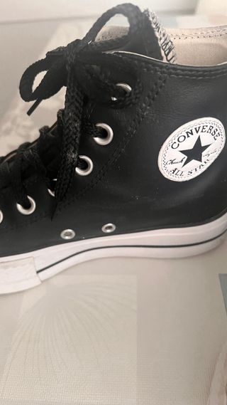 Zapatillas Converse de cuero con plataforma. - Diseño alto. - Cordones blancos. - Suela de goma. - Detalle de estrella en el lateral. Incluye caja original.