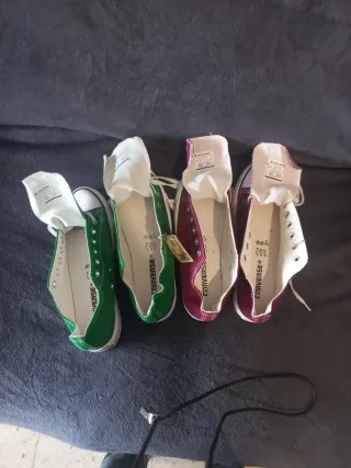 Vendo tres pares de zapatos o tenis usados del 41: dos pares de zapatillas rojas Natural World y un par de zapatillas verde oliva Converse. Las zapatillas presentan un desgaste por el uso pero están en buen estado. - Tres pares de zapatos - Marcas: Converse y Natural World, regalo las rojas del Lefties.