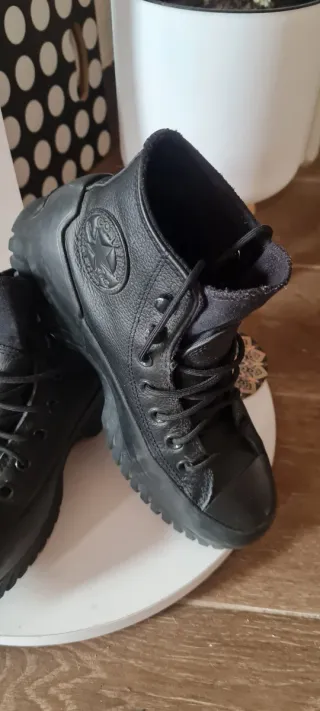 Zapatillas Converse de bota con un diseño moderno y llamativo. - Combinación de colores negro y blanco. - Plataforma gruesa para un estilo único. - Cierre con cordones blancos. - Detalle del logo circular de Converse All Star.