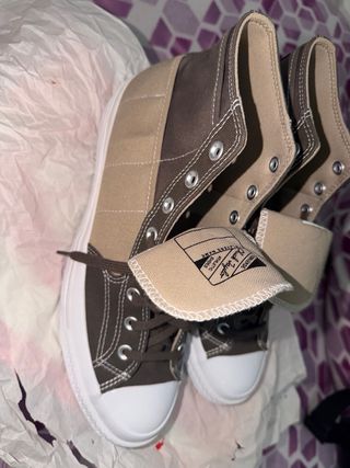Son zapatos converse originales de talla 39 color marrón (un tono raro de marrón) con diseño de como si fueran manchados (o algo así como un marrón degradado).