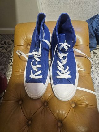 Zapatillas unisex altas Converse Chuck Taylor All Star. En color azul/blue ribbon. De lona. Talla 39 - Cierre con cordones blancos. - Suela de goma blanca. - Detalle de logo circular en el lateral. - Color azul (Blue ribbon) - En su caja original Algo usadas y con el borde un poco despegado al doblar la zapatilla (como se puede ver en la última foto)