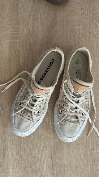 Lote de tres pares de zapatillas Converse. - Zapatillas de lona. - Diseño clásico de caña alta y baja. - Combinación de colores beige y blanco. - Suelas prácticamente nuevas Usadas por chica, nada de deporte con ellas, solamente vestir...todavía tienen recorrido....cualquier duda preguntar...se venden los 3 pares juntas....