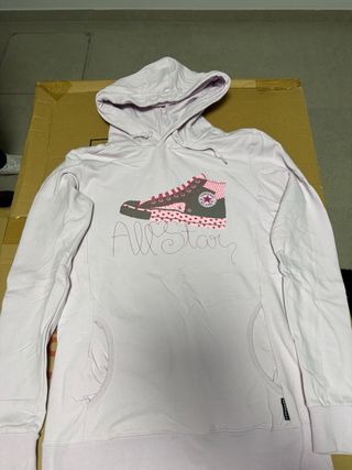 Preciosa sudadera con capucha de la marca Converse, en color rosa y talla S. Es una prenda suave y cómoda, ideal para el entretiempo. - Tiene un diseño de capucha con forro polar. - Presenta el logo de Converse bordado en el pecho. - Está en muy buen estado. - Dos bolsillos -