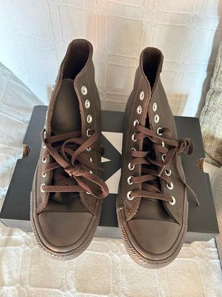 Zapatillas altas Converse Chuck Taylor de piel en color marrón. Talla 41 a estrenar - Material exterior de piel repelente al Agua - Cordones marrones a juego. - Suela de goma. - Diseño clásico de caña alta.