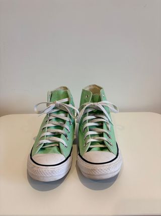 Zapatillas Converse All Star de caña alta en un llamativo color verde menta. Perfectas para un estilo casual y moderno. - Diseño de caña alta. - Cordones blancos. - Suela de goma blanca.