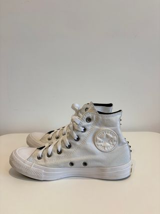 Zapatillas Converse All Star de caña alta en color blanco, talla 38, con detalle especial de tachuelas metálicas en la parte trasera, que les da un toque rockero y diferente al modelo clásico. Están usadas, pero bien conservadas. Presentan: • Suciedad visible en la suela (limpiable). • Ligeras marcas en la lona blanca, propias del uso, también recuperables con limpieza. • Estructura, costuras y forma en buen estado. • Cordones originales. Un modelo especial, ideal para quien busca unas Converse distintas, con personalidad y un punto cañero.