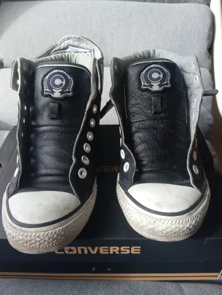Zapatillas Converse de efecto cuero en color negro. - Detalle de logo en la lengüeta. - Suela de goma blanca. - Cordones color blanco crema, se los he quitado para lavarlos. Pero también te las piedo mandar con cordones negros en vez de blancos si lo prefieres, que tengo porque compro para cambiar los colores a mis zapatillas. Mirar última foto. Una lleva un cordón negro más grueso y la otra más fino. Piedes elegir el que más te guste. -En buen estado, usadas pero aún tienen mucha vida. Tal como salen en las fotos.