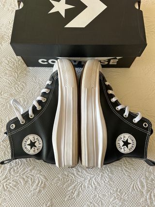 Zapatillas altas Converse Chuck Taylor All Star de mujer, color blanco. - Talla 37. - Con plataforma. - Exterior de piel sintética que se puede limpiar fácilmente (a diferencia de las que son de lona). Muy poco uso, tienen algún doblez que se puede ver en las fotos.
