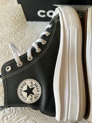 Zapatillas Converse negras con detalles blancos, en su caja original. - Diseño de caña alta. - Suela gruesa con plataforma. - Cordones blancos. -muy prácticos cómodos