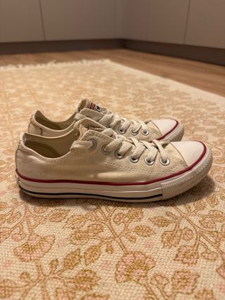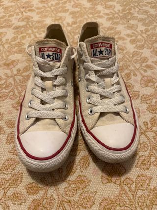 Zapatillas Converse de lona en color blanco. Un clásico para el día a día. En buen estado solo que el color del blanco se ha vuelto un poco amarillento (a lo mejor sabes cómo volver a ponerlas blancas o te gustan así como le gustan a mucha gente, usadas 😉) - Cierre con cordones. - Detalle de banda en la suela. - Logo de Converse All Star en la lengüeta.