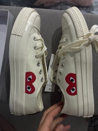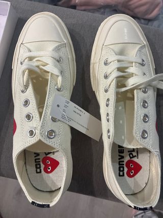 Zapatillas Converse Chuck Taylor All Star x Comme des Garçons PLAY en color blanco roto. Un clásico reinventado con el icónico corazón de CDG. - Diseño de caña baja. - Cordones blancos. - Suela de goma. - Detalle del corazón de CDG en la plantilla. -Talla 39 24,5cm -Con su caja( aunque está algo rota)perfectas para regalar. -Valieron 150€ pero tengo otras similares y no las he estrenado