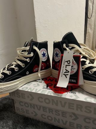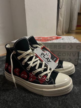 Zapatillas altas Converse x Comme des Garçons Play. - Diseño clásico en negro con el icónico corazón rojo. - Cordones blancos. - Suela de goma blanca.
