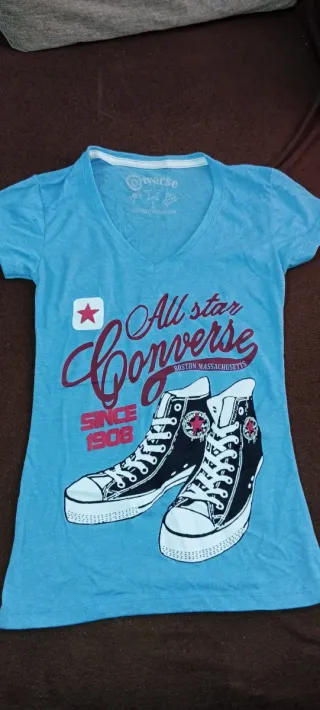 Camiseta azul de manga corta con estampado de zapatillas Converse All Star y el año 1908. - Diseño frontal con zapatillas icónicas. - Detalle de All star Converse y Since 1908. - Cuello en V.