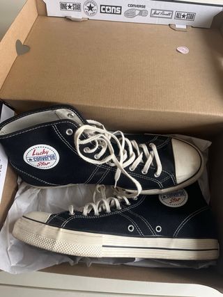 Zapatillas altas Converse negras con detalles blancos y el distintivo parche Lucky Star. - Diseño de caña alta. - Cordones blancos. - Suela de goma blanca.