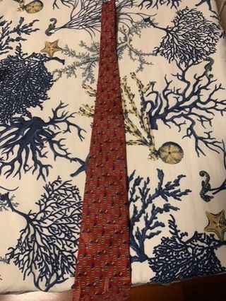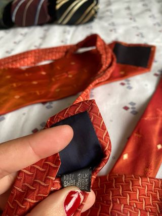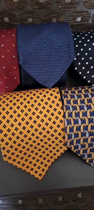 Conjunto de cinco corbatas de seda con diferentes diseños. - Corbata a rayas negro y dorado giacomo 6,5€ - Corbata roja con estampado geométrico lester 6,5€ - Corbata naranja con pequeños motivos florales azules marca richel ( el corte ingles) 6,5€ - Corbata lisa marrón zara 6,5€ - Corbata a rayas naranjas y celestes francisco pavon 6,5€ Una sola puesta y algunas sin estrenar Se venden juntas o por separado