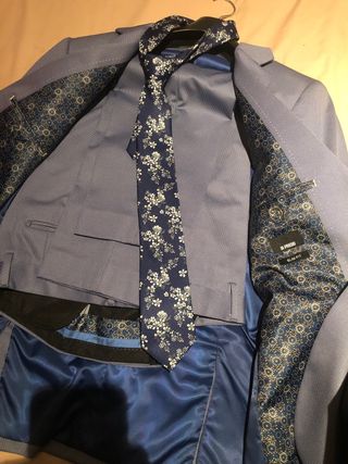 Traje azul con corbata floral