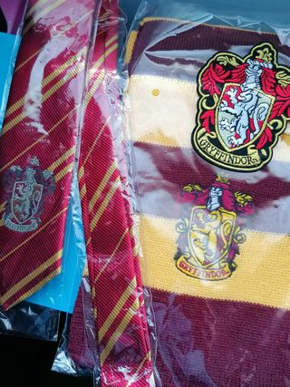 Conjunto de bufanda, parche y corbata con el escudo de Gryffindor bordados. Diseño a rayas rojas y doradas. Escudo de Gryffindor bordado. De las otras casas en mi perfil.
