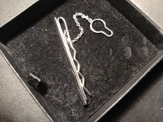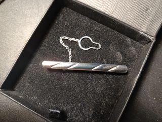 Elegante alfiler de corbata fabricado en acero. Cuenta con una cadena para mayor seguridad. - Diseño con líneas grabadas.