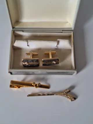 Gemelos y pasador de corbata dorados