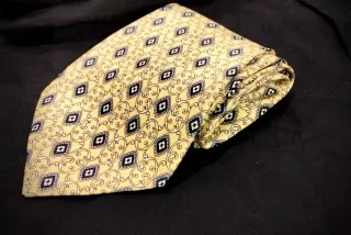 Elegante corbata de seda italiana, elaborada a mano con un diseño clásico. - Patrón de rombos y arabescos. - Tonos amarillos y detalles en negro y gris.