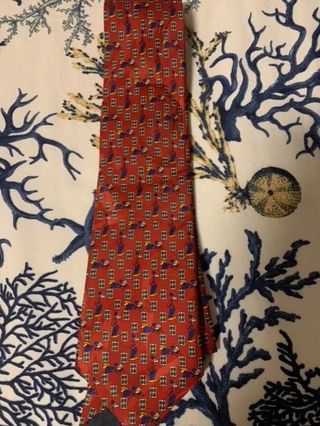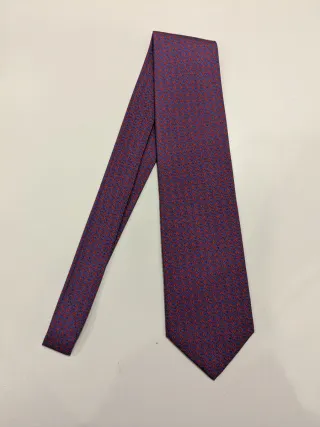 Elegante corbata de la prestigiosa marca Hermès. - Diseño con patrón de H repetido. - Tonos rojos y oscuros.