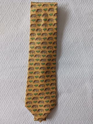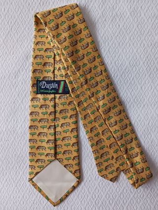 Corbata de la marca Dustin con un divertido estampado de tigres y árboles. - Diseño único con tigres. - Tonos amarillos y verdes.
