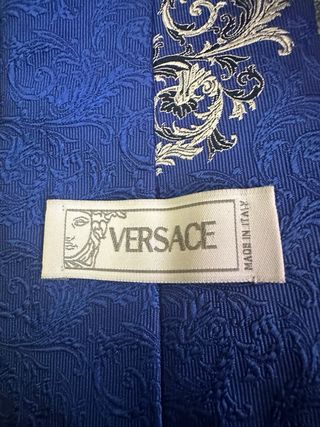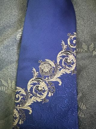 Elegante corbata de la marca Versace con un diseño distintivo. 100% seda Edicion muy limitada y buscada - Color azul profundo. - Adornada con un intrincado patrón ornamental en tonos dorados y negros. - Presenta el icónico motivo Medusa de Versace.