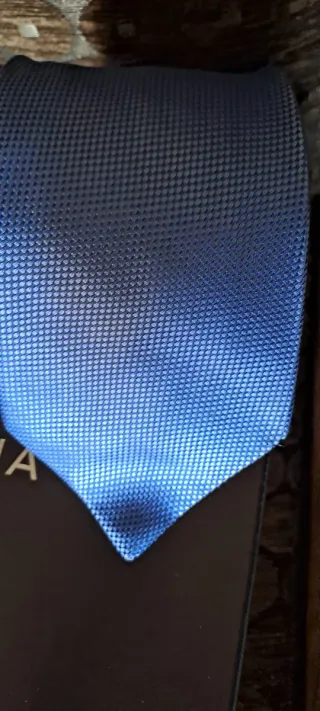 Corbata lisa de color azul, presentada en su caja original. - Diseño elegante y versátil. - Ideal para complementar atuendos formales.