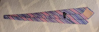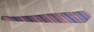 Elegante corbata de seda natural con un diseño de rayas diagonales en tonos azules y rosas. Un accesorio clásico y sofisticado. - Material: 100% seda natural. - Diseño: Rayas diagonales. - Textura: Tejido con un patrón sutil.